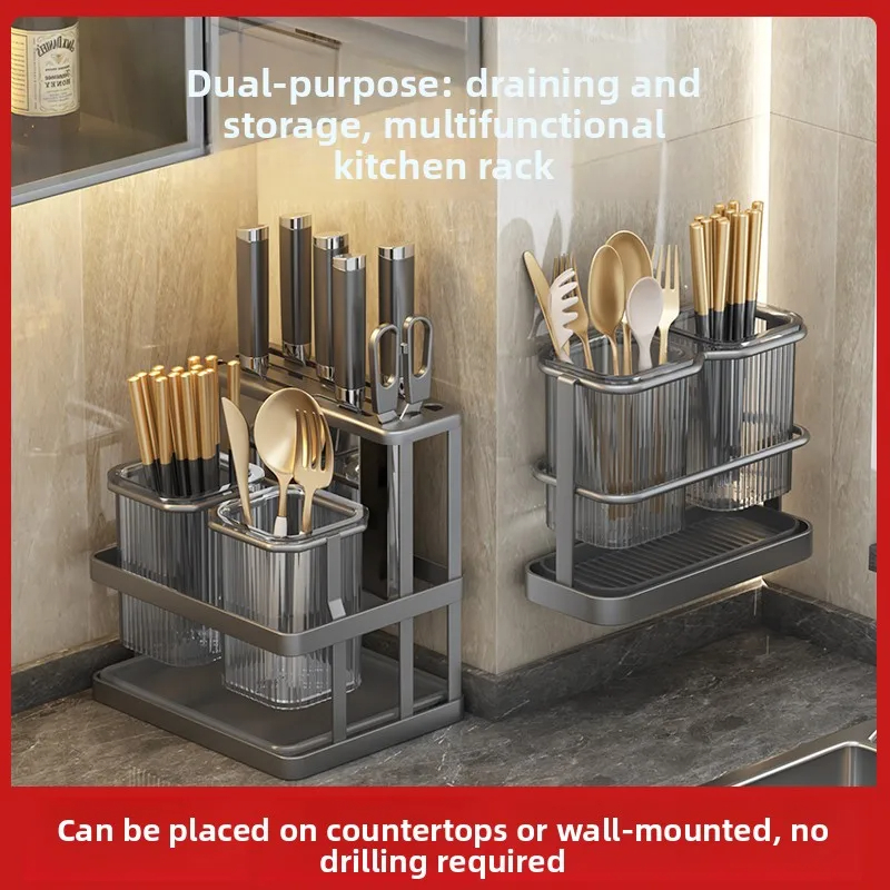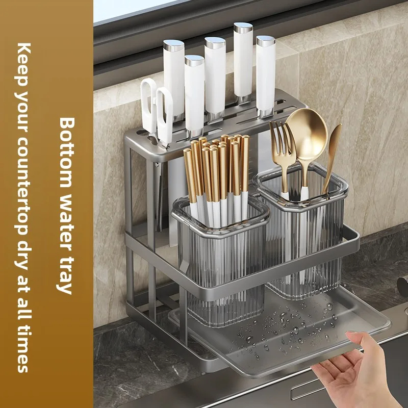 Fabricado en acero inoxidable de color negro, su diseño vertical ahorra espacio y añade un toque moderno a cualquier estilo de cocina. Cuenta con compartimentos específicos para cuchillos de diferentes tamaños, así como dos recipientes de gran capacidad para cubiertos, espátulas, palillos y más.